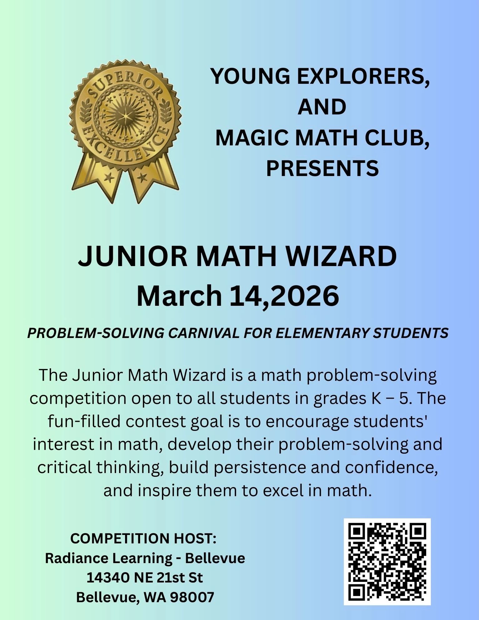The Junior Math Wizard is a math problem-solving competition open to all students in grades K – 5. The fun-filled contest goal is to encourage students' interest in math, develop their problem-solving and critical thinking, build persistence and confidence, and inspire them to excel in math.